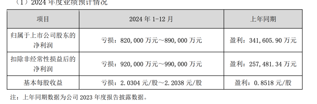 1月24日晚间,TCL中环发布2024年度业绩预告显示,预计2024年净利润为负值,归属于上市公司股东的净利润亏损82亿元至89亿元,扣除非经常性损益后的净利润亏损92亿元至99亿元,基本每股收益亏损2.0304元/股~2.2038元/股。