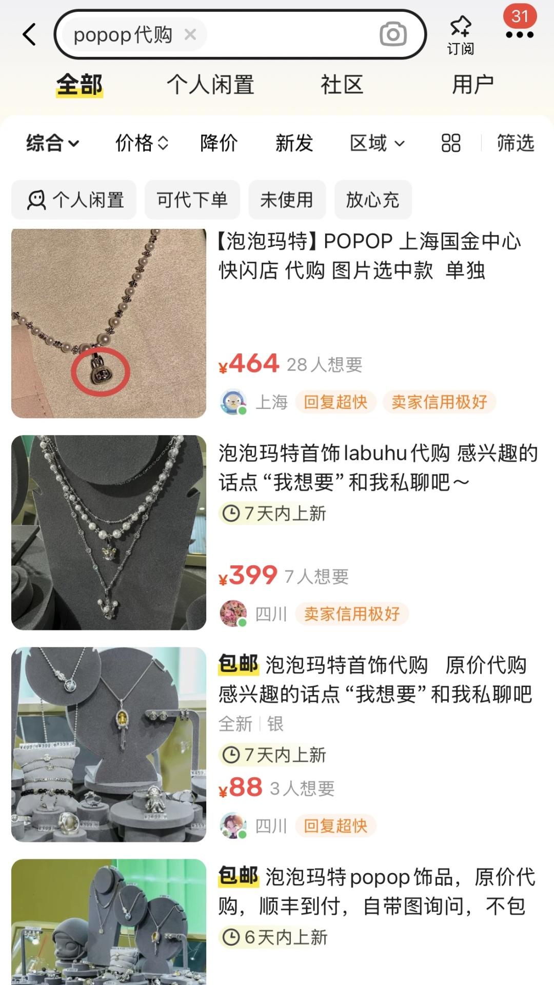 记者了解到,POPOP饰品的价格区间在249元到2699元之间,饰品均带有泡泡玛特自身的IP元素。由于所有饰品尚未在线上店铺上架,仅在部分城市线下限时店出售,甚至有粉丝找起了代购。