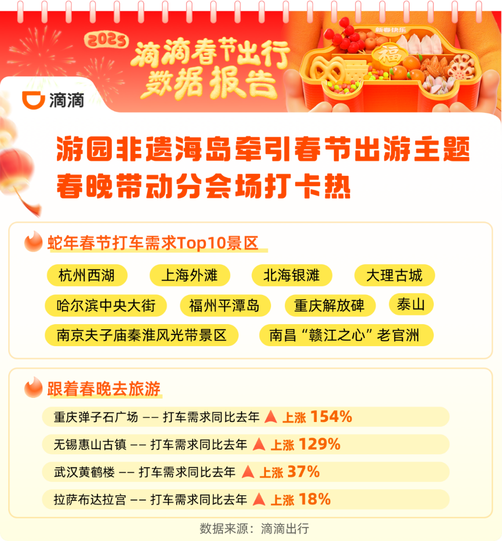 春节假期,旅游景点打车需求与年前相比上涨137%,正月初四迎来春节旅游打车高峰。受新年活动、海岛游、非遗效应等带动,南京夫子庙秦淮风光带景区、福州平潭岛、杭州西湖、哈尔滨中央大街、上海外滩、重庆解放碑、北海银滩、南昌“赣江之心”老官洲、泰山、大理古城成蛇年春节打车需求Top10景区。