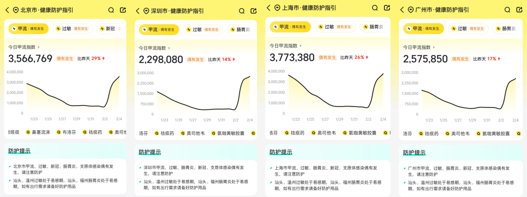 记者从美团买药了解到,2月4日,玛巴洛沙韦及奥司他韦销量较上周增长均超2倍。从居家快检检出率来看,整体甲流阳性检出率较春节前有所降低。受春节返程高峰影响,深圳甲流阳性检出率出现波动性上涨。2月2日,深圳甲流阳性检出率为14%,近两日该数据已超20%。