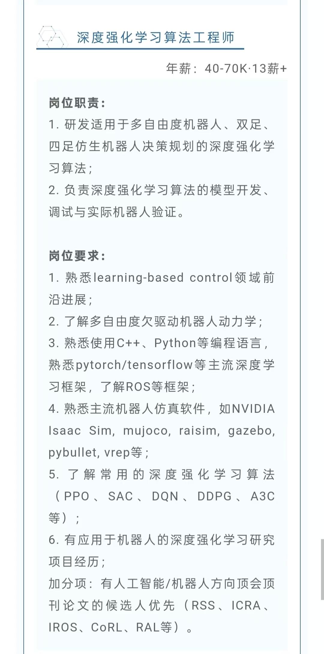 2月10日,据杭州市滨江区委宣传部官号“滨江发布”消息,宇树科技正广纳贤才。具体来看,宇树科技正在招聘机械结构工程师、嵌入式软件工程师、嵌入式硬件工程师、生成式AI算法工程师、深度强化学习算法工程师、机器人感知算法工程师等多个岗位。其中,薪酬最高的岗位为深度强化学习算法工程师和生成式AI算法工程师,这两个岗位的月薪范围均为4万元~7万元,按13薪+来计算,该岗位年薪最高将超过90万元。