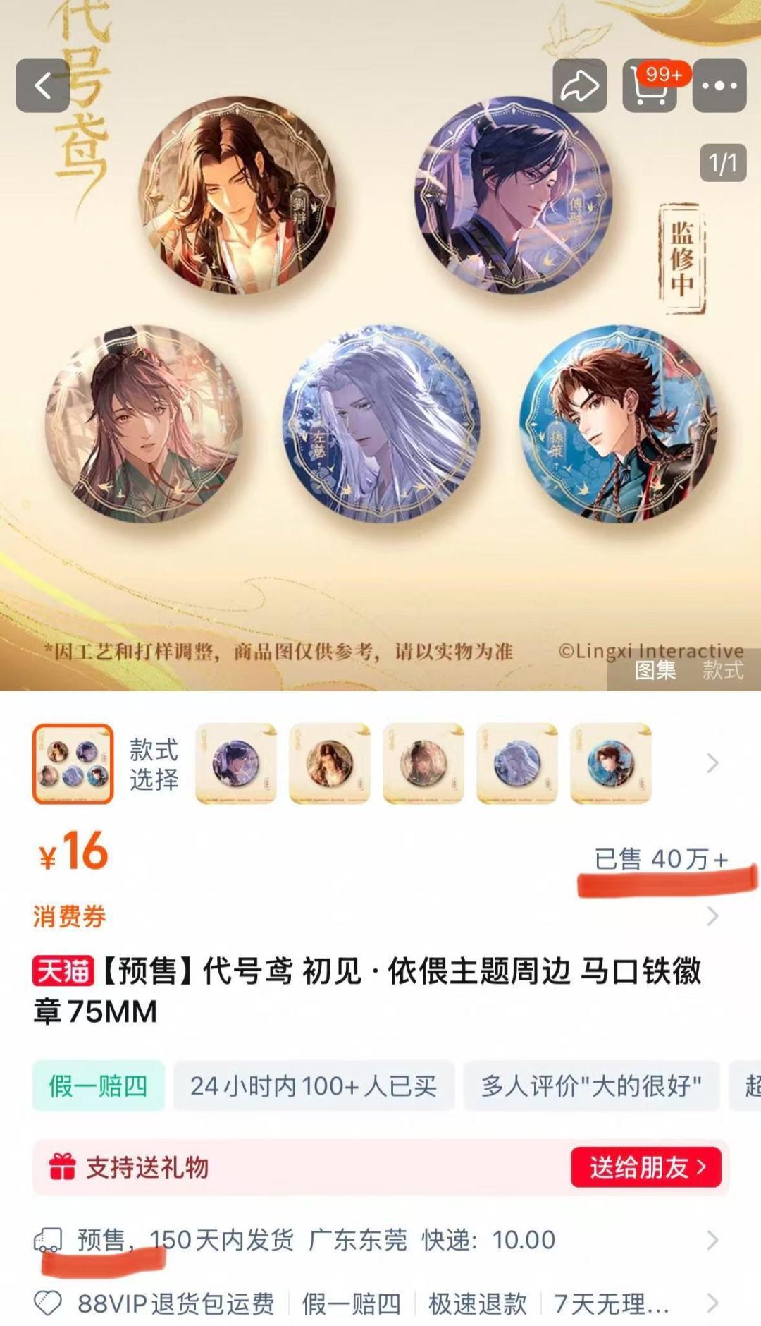 在游戏领域,《原神》《代号鸢》等均根据自身角色推出实体周边产品,线上店铺显示,《代号鸢》一款徽章的销售额已经超出40万元,预售发货期限长达150天内。