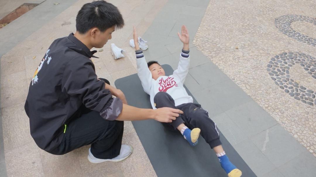 课程总时长为一小时,今天的课程是臀腿训练,教练先同子阳在小区空旷地区进行了慢跑,还用小路障器材设计了一场“追赶游戏”进行热身,随后便开始了高抬腿、平板支撑等体能训练。