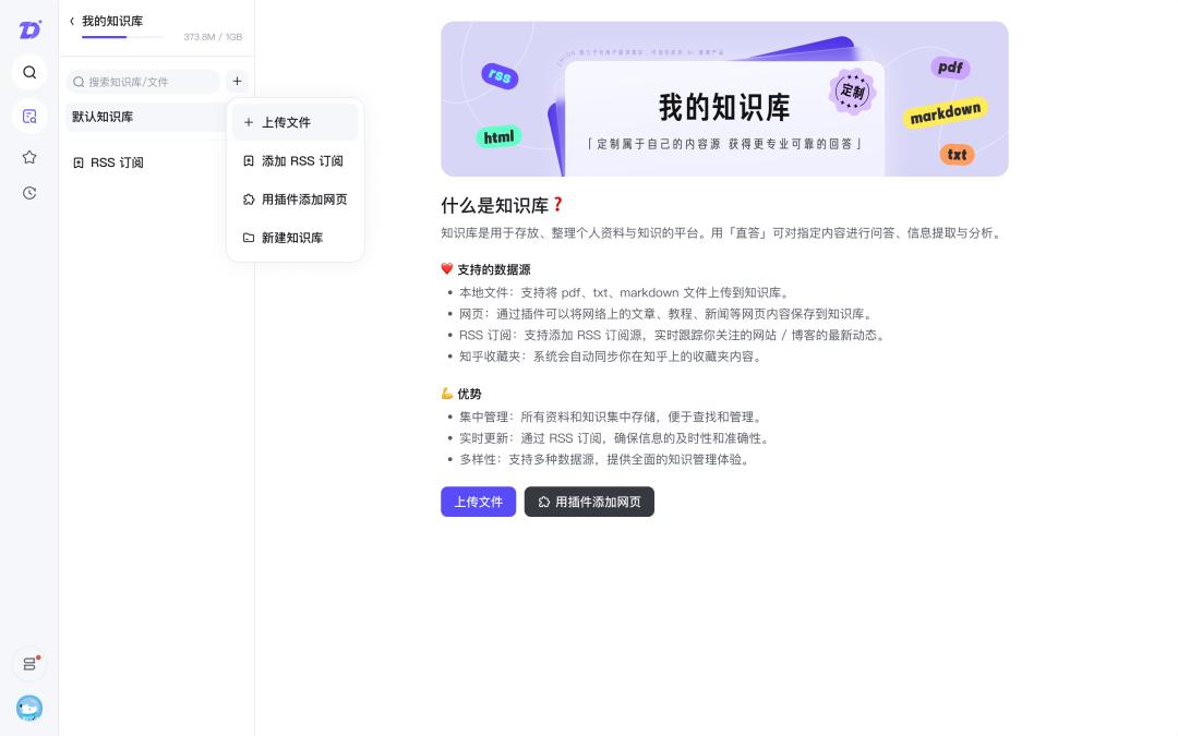 此外,知乎直答还同步上线知识库功能,集合了本地文件上传、网页收藏、RSS订阅、知乎收藏夹等模块,用户可使用DeepSeek-R1模型对论文、文档、网页、知乎问答等特有内容进行信息提取、分析和分享,便于构建和管理属于用户的个人知识库。