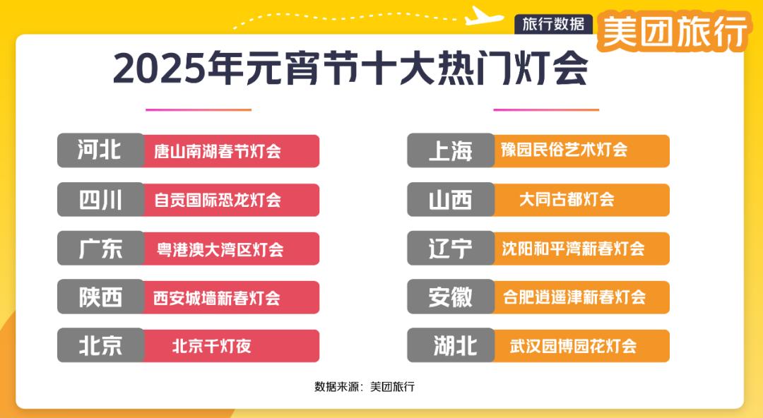 除了无人机外,灯会这项传统习俗加入科技等现代元素,越来越受到00后的青睐。美团旅行数据显示,2月第一周,“元宵灯会”搜索量同比上涨351%,“元宵灯谜”搜索量同比上涨超225%。数据显示,2025年元宵十大热门灯会分别是:唐山南湖春节灯会、自贡国际恐龙灯会、粤港澳大湾区灯会、西安城墙新春灯会、北京千灯夜、豫园民俗艺术灯会、大同古都灯会、沈阳和平湾新春灯会、合肥逍遥津新春灯会、武汉园博园花灯会。
