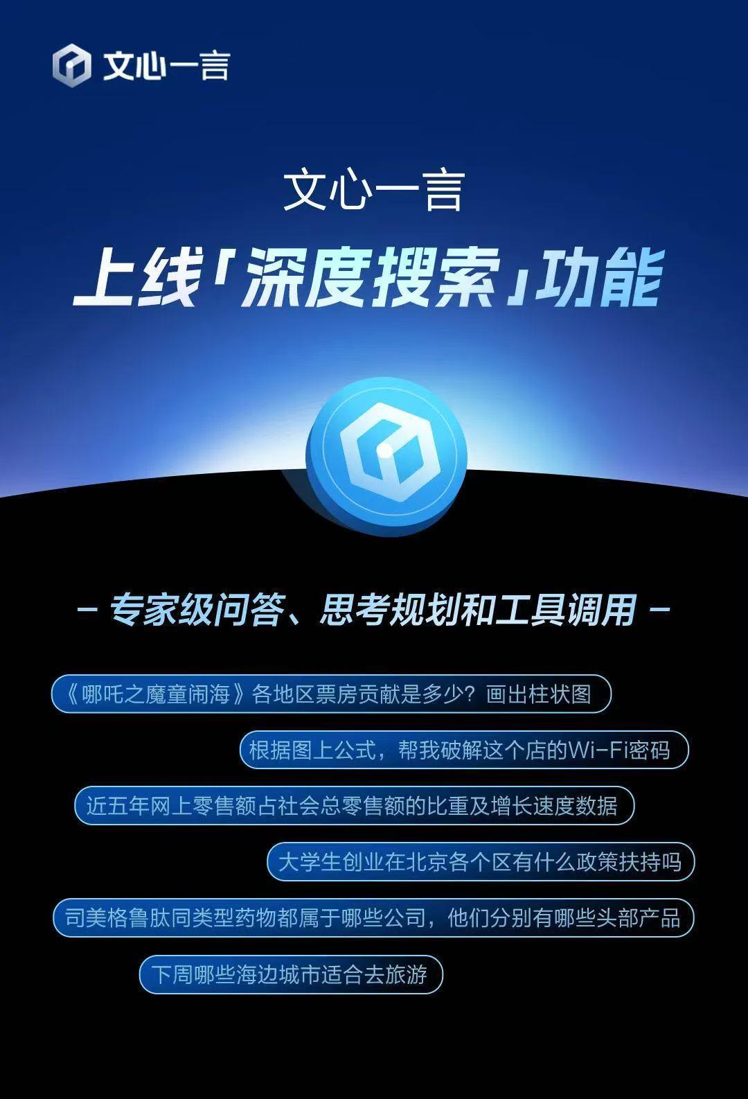 百度表示,深度搜索功能,具备更强大的思考规划和使用外部工具能力,可为用户提供专家级内容回复,并处理多场景任务,实现多模态输入与输出。当前,用户可在文心一言官网上体验深度搜索功能,APP端也即将同步上线。