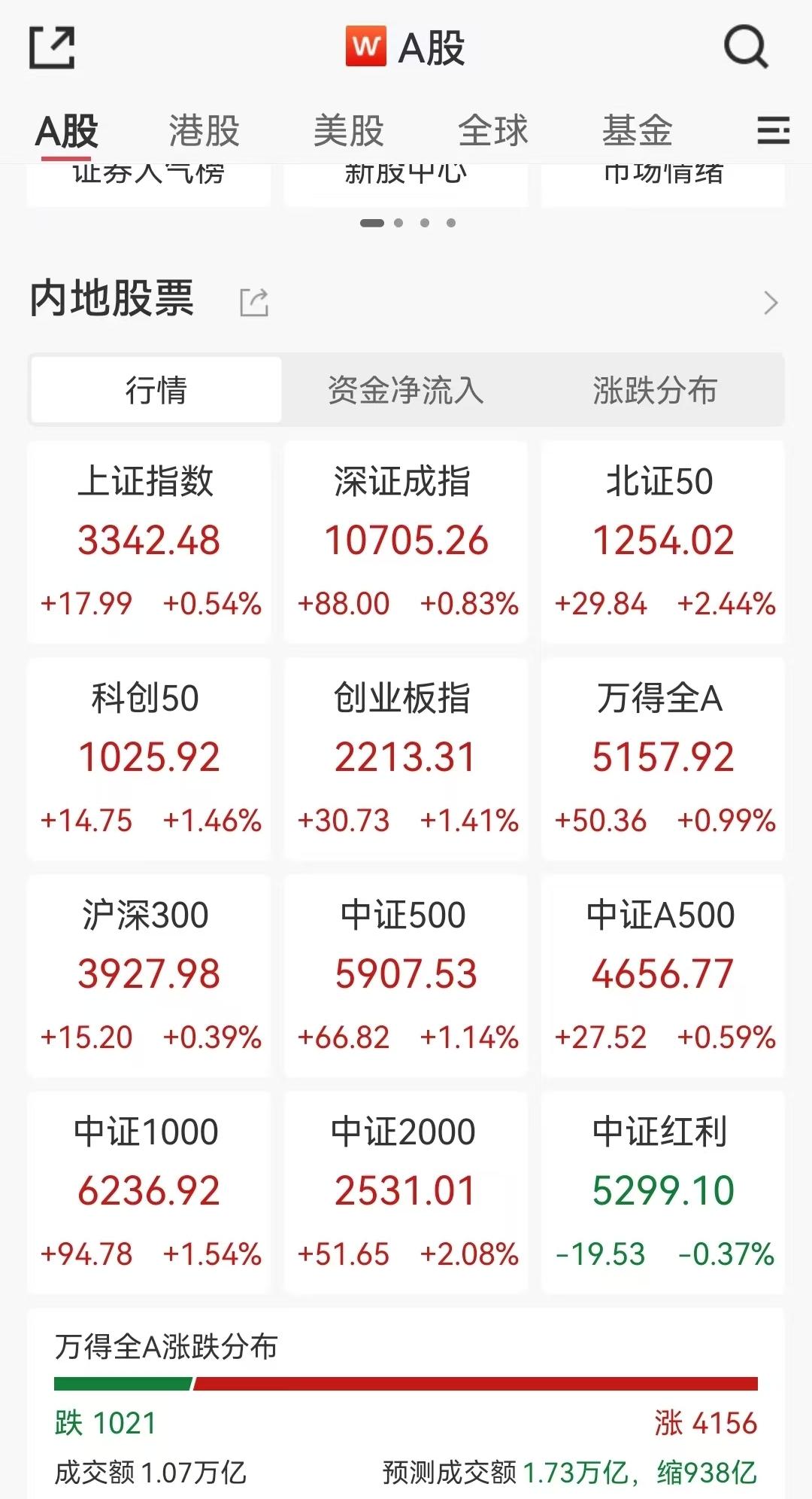 2月19日,A股三大指数集体上涨,截至午间收盘,上证指数涨0.54%,创业板指涨1.41%。市场半日成交1.07万亿元,超4100只股票上涨。Wind数据预测,全日成交额有望超1.7万亿元。