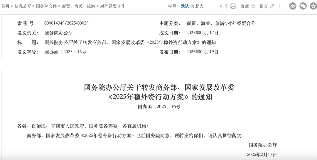 2月19日,中国政府网发布国务院办公厅关于转发商务部、国家发展改革委《2025年稳外资行动方案》(下称《行动方案》)的通知。通知提到,扩大电信、医疗、教育等领域开放试点,落实全面取消制造业领域外资准入限制要求,鼓励外资在华开展股权投资,持续打造“投资中国”品牌,取消外商投资性公司使用境内贷款限制等。