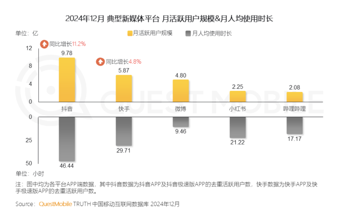 新媒体平台已深度融入人们的日常生活,短视频领域更是展现出强劲的增长势头,抖音与快手平台的用户规模持续攀升。数据显示,截至2024年12月,抖音月活跃用户规模同比增长11.2%达9.78亿;快手月活跃用户规模为5.87亿,同比增长4.8%。