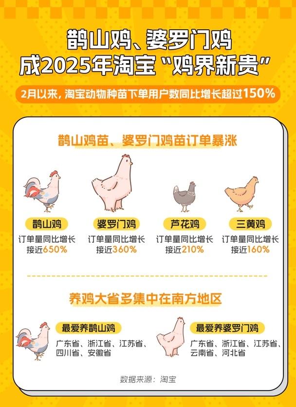养鸡户们正在淘宝重新定义“鸡生价值”。数据显示,自今年2月以来,淘宝动物种苗下单用户数同比增长超过150%,其中鸡苗最为畅销。拥有五彩凤羽的鹊山鸡订单量同比暴涨接近650%,鸡中“海归精英”的婆罗门鸡订单量同比增长超过360%,大幅超越了传统芦花鸡、三黄鸡的订单增长。