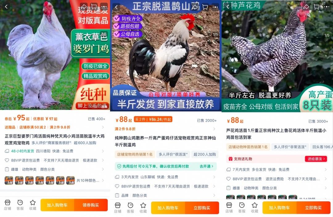 当一些鸡在田间创造经济价值时,另一些鸡正在踏入城市家庭。记者观察到,在社交平台上,与“宠物鸡”相关的视频播放量超过15亿次。淘宝上,鸡衣服、遛鸡绳、鸡尿不湿、定制鸡窝等和宠物鸡相关的衍生商品层出不穷。