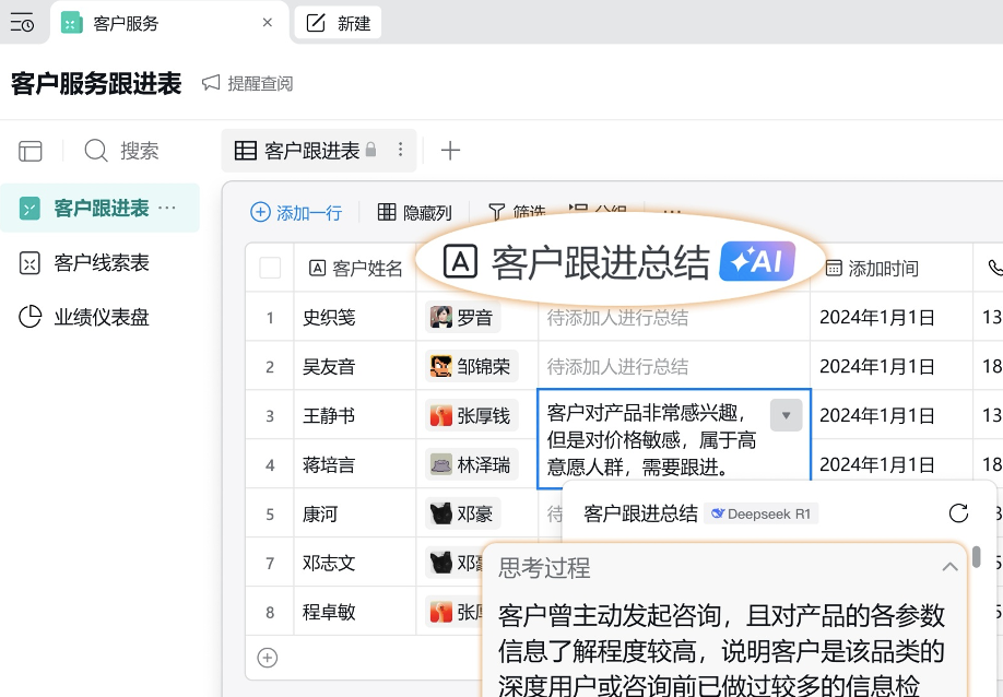 “智能表格”接入DeepSeek客户跟进一键“AI服务”