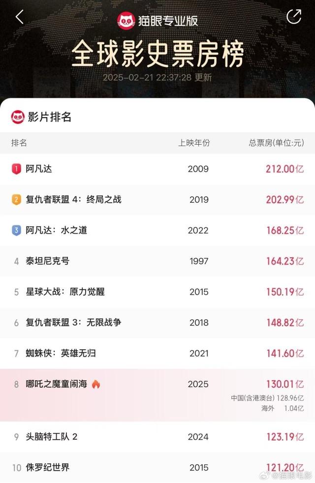 据猫眼专业版数据,《哪吒之魔童闹海》全球票房(含预售及海外)破130亿,暂列全球票房榜第8位!
