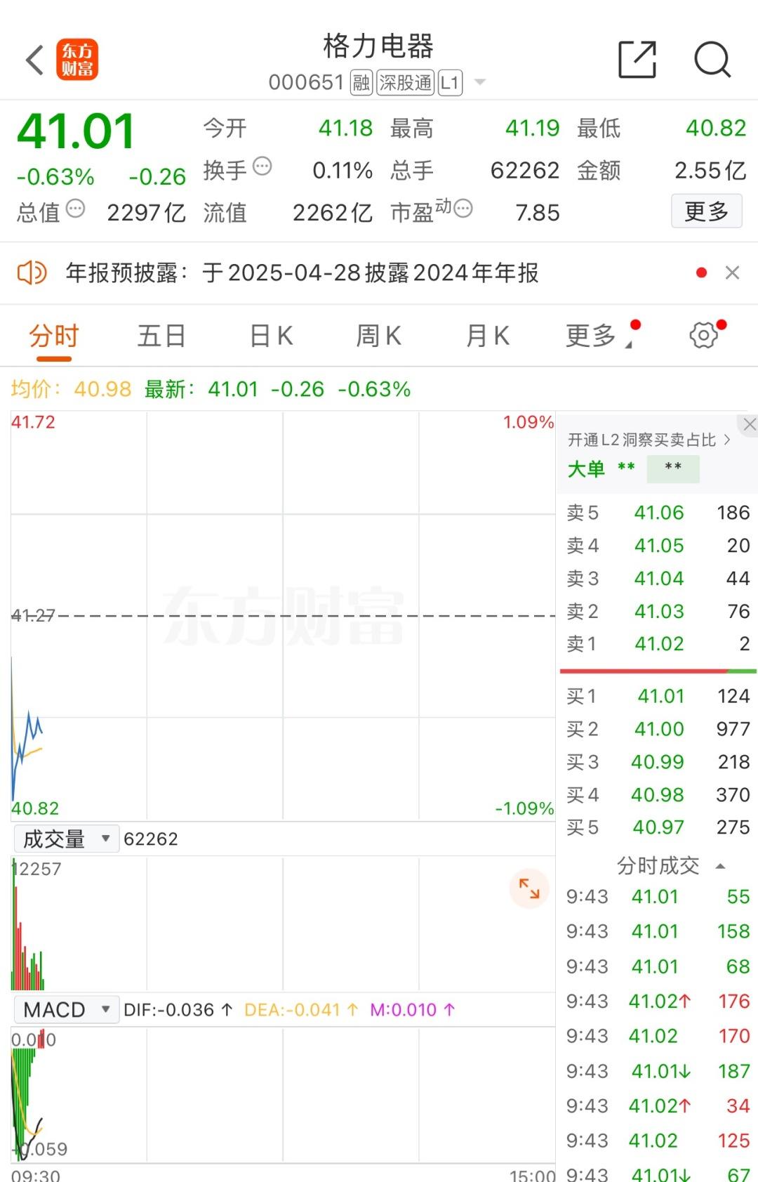 2月25日,格力电器开盘报41.18元/股。截至发稿,格力电器股价41.01元/股,下跌0.63%。