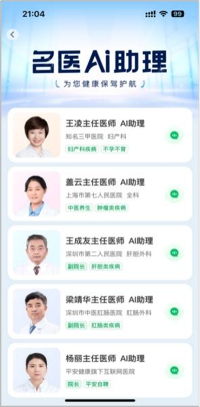 平安健康本次推出数字分身“平安芯医”,用户足不出户,无需预约,面对医生专家们的形象和音色,即可以图文、语音、视频等形式实时获取专业的医疗健康建议。医生专家们与平安健康共同建设、训练AI分身,基于三大数据层,将海量知识图谱与医生个人临床实践结合,并不断进行医患模拟,提升服务精准度。目前平安健康“平安芯医”已上线肛肠外科、肝胆外科、妇产科相关专科大咖医生,包括2024年“金扁鹊”中医百强个人王凌医生,深圳肝胆外科第一人王成友医生等。