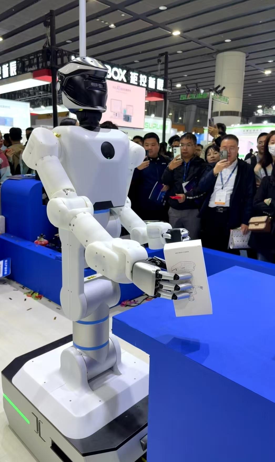 记者注意到,展会上,一款“广州造”人形机器人吸引了众多目光。它能精准地将物品从一侧搬运到另一侧,动作流畅高效,展现出强大的灵活性和控制能力。