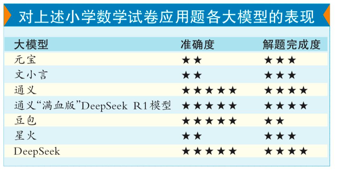 今年1月,某地小学数学试卷引发热议,网友纷纷称其为“难出天际”的数学试卷。如今,在学生学习的过程中,越来越多家长都会用上大模型应用作为助手,帮助孩子解题并提供解题思路。记者从这份“难出天际”的小学四年级试卷中随机抽取一提应用题,看看六家模型会给出怎样的答案。