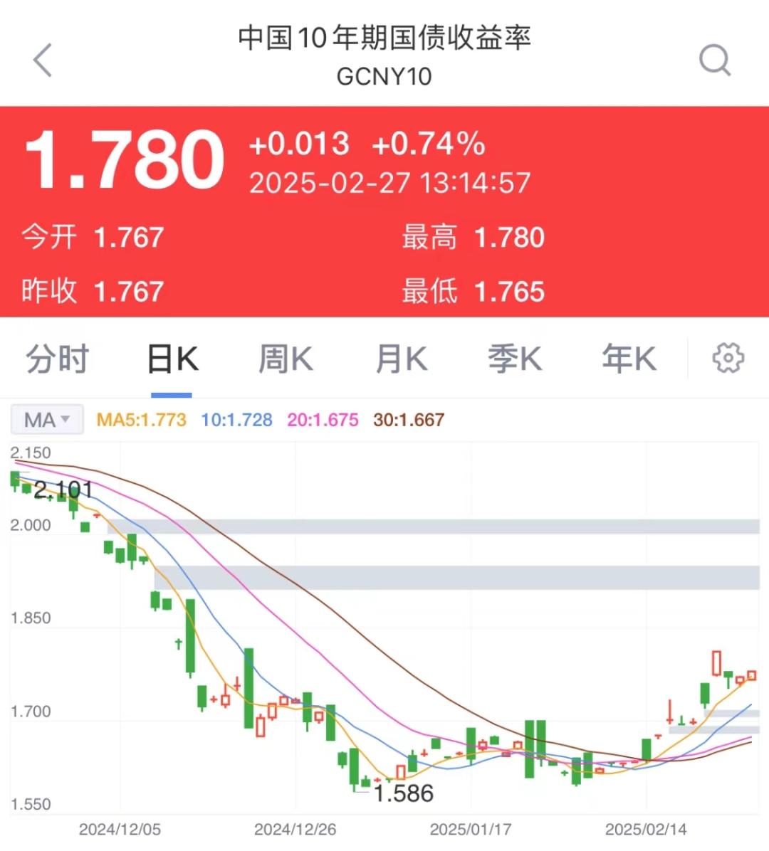 2月27日,不同期限国债收益率普遍上行,其中10年期国债活跃券收益率盘中一度上行至1.7325%,5年期国债活跃券收益率盘中一度上行至1.6150%。由于债券收益率和价格成反比,这也意味着债券价格走低、债市走弱。从反映国债价格变动预期的国债期货价格来看,2月27日,国债期货全线低开,30年期主力合约盘中跌0.03%,10年期主力合约盘中跌0.02%。