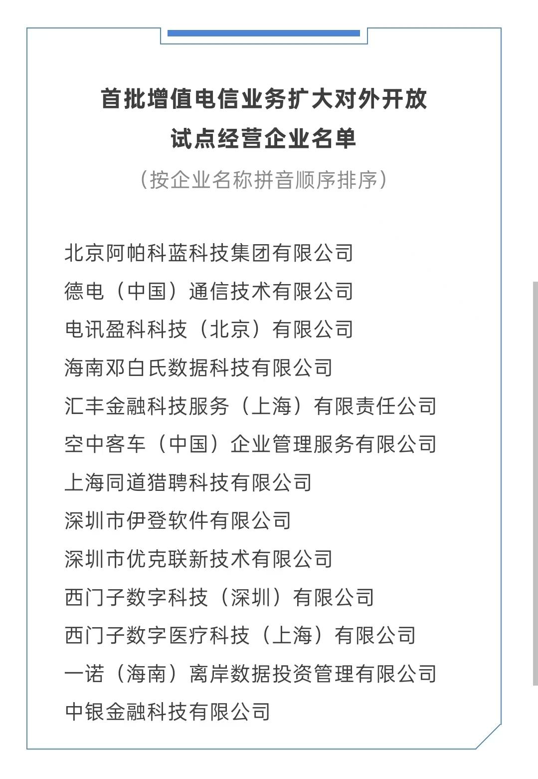 2月28日,据“工信微报”消息,工业和信息化部近日向北京、上海、海南、深圳四地13家外资企业发放增值电信业务经营试点批复。相关企业按照批复内容,可开展互联网接入、信息服务等增值电信业务。