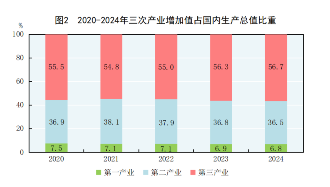 2月28日,国家统计局发布中华人民共和国2024年国民经济和社会发展统计公报。公报显示,初步核算,全年国内生产总值1349084亿元,比上年增长5.0%。其中,第一产业增加值91414亿元,比上年增长3.5%;第二产业增加值492087亿元,增长5.3%;第三产业增加值765583亿元,增长5.0%。