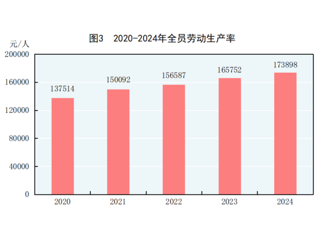 分季度看,一季度国内生产总值同比增长5.3%,二季度增长4.7%,三季度增长4.6%,四季度增长5.4%。全年人均国内生产总值95749元,比上年增长5.1%。国民总收入1339672亿元,比上年增长5.1%。全员劳动生产率为173898元/人,比上年提高4.9%。
