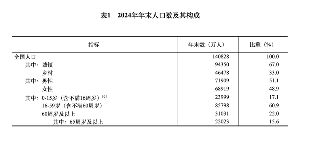 年末全国人口140828万人,比上年末减少139万人,其中城镇常住人口94350万人。全年出生人口954万人,出生率为6.77‰;死亡人口1093万人,死亡率为7.76‰;自然增长率为-0.99‰。