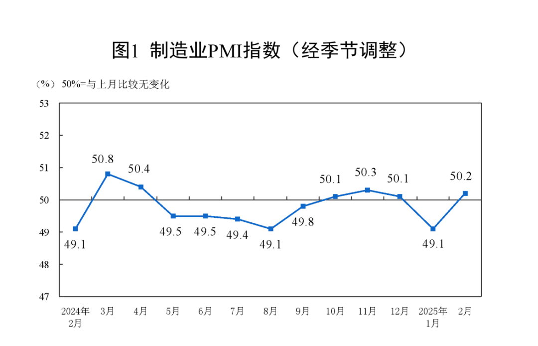 3月1日,国家统计局公布2025年2月中国采购经理指数显示,2月份,制造业PMI升至50.2%,重返扩张区间;非制造业商务活动指数为50.4%,比上月上升0.2个百分点,非制造业继续保持扩张。综合PMI产出指数为51.1%,比上月上升1.0个百分点,持续位于扩张区间。