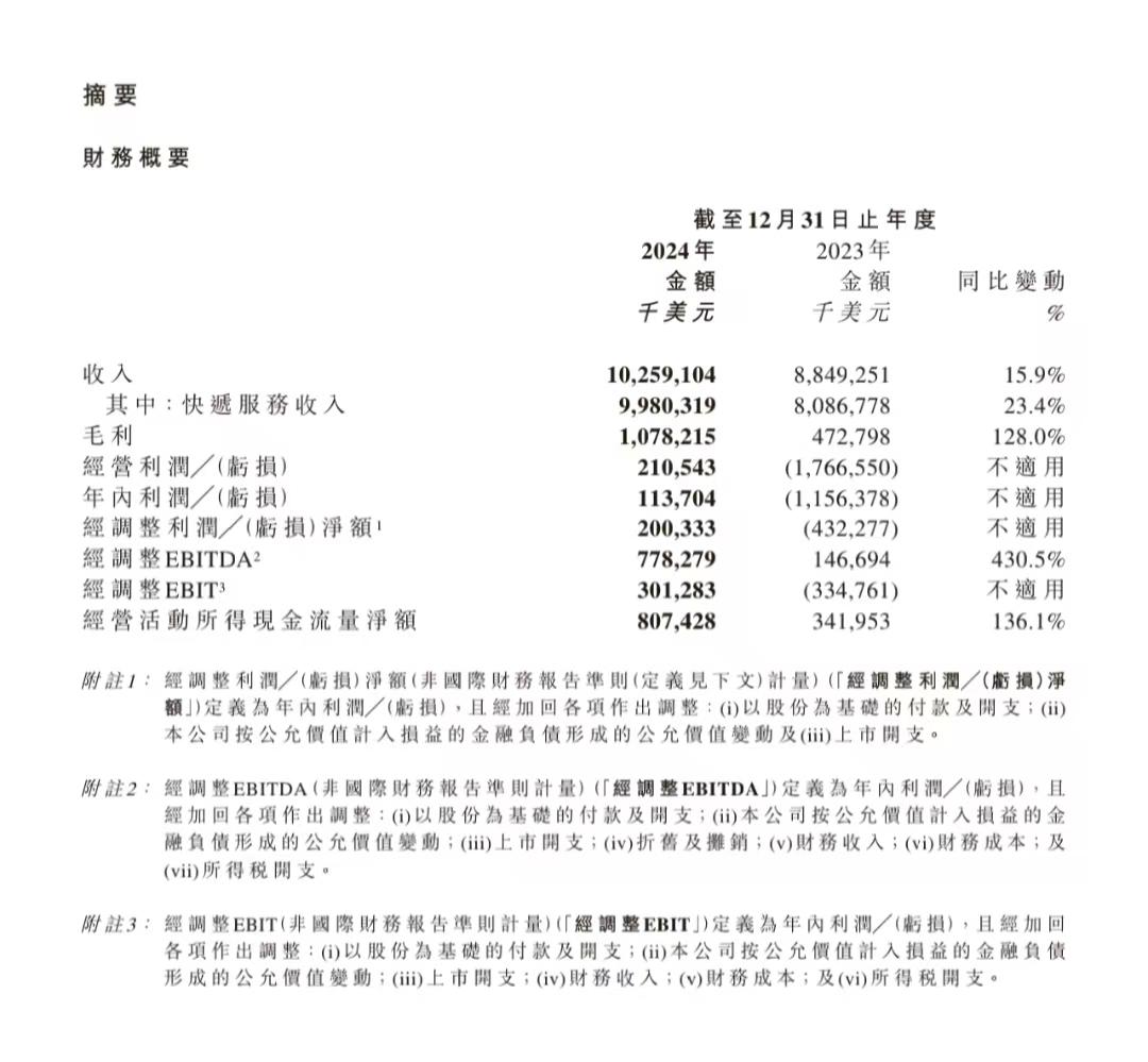 业绩期内,极兔所有盈利指标全面转正。净利润达到1.1亿美元,较2023年亏损11.6亿美元大幅好转;经调整净利润约2亿美元,超出市场预期。经调整EBITDA达到7.8亿美元,大幅增长430.5%;经调整EBIT转正,达到3亿美元。