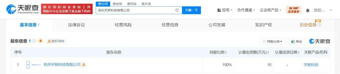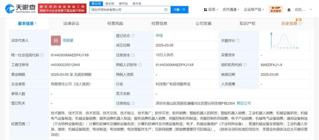 天眼查App显示,近日,深圳天羿科技有限公司成立,法定代表人为周昌慧,注册资本10万人民币,经营范围含智能机器人的研发、智能机器人销售、工业机器人销售、机械设备研发、机械电气设备制造、服务消费机器人制造、计算机软硬件及辅助设备批发、计算机软硬件及外围设备制造等。股东信息显示,该公司由杭州宇树科技有限公司全资持股。