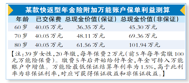 资深保险代理人谢女士介绍,“部分年轻投资者购买的快返型年金险在缴费5年后就开始给付年金,但他们暂时不会动用到这笔钱,而是把年金转入分红险或万能险账户中,让每年获取的年金再次增值。”