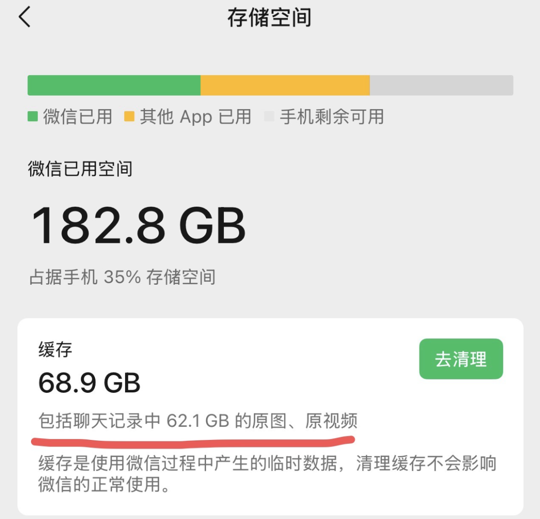 微信作为国民级应用,承载着大家生活、工作上的海量信息。随着使用时长与日俱增,用户的存储压力日益凸显,有研究发现,聊天记录往往占据微信80%以上的存储空间。此外,移动设备摄像头像素升级,让高清内容渐成存储负担,原图、原视频愈发成为占据存储空间的大头。以某重度用户为例,其微信已用空间182GB中,原图、原视频独占62GB,占比高达34%。