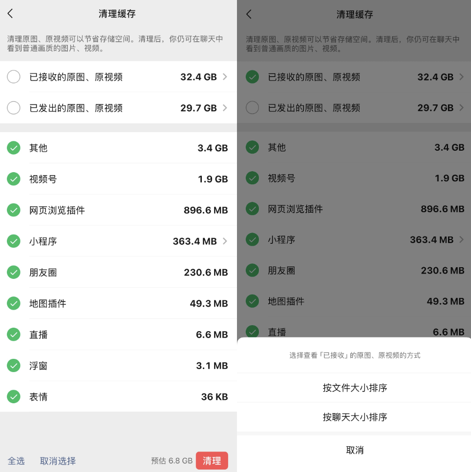 据了解,微信此次更新,支持用户高效、灵活地清理原图、原视频。批量清理上,支持同时清理“已接收的原图、原视频”与“已发出的原图、原视频”,无须逐条翻找,节省时间。按需精细清理上,用户可按文件大小、聊天对象排序筛选,快速定位大文件或特定对话内容。