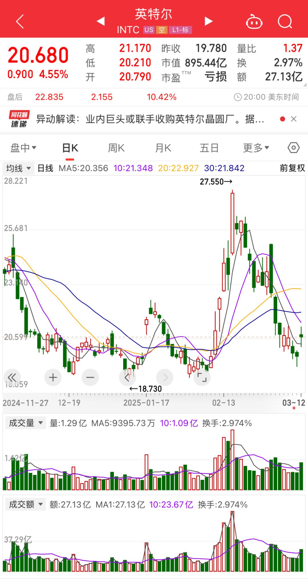 受消息影响,当地时间3月12日美股收盘,英特尔股价上涨4.55%,市值895.44亿美元。