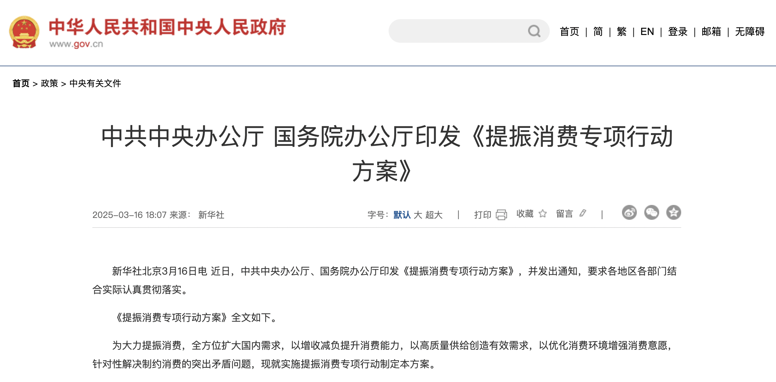 近日,中共中央办公厅、国务院办公厅印发《提振消费专项行动方案》,并发出通知,要求各地区各部门结合实际认真贯彻落实。