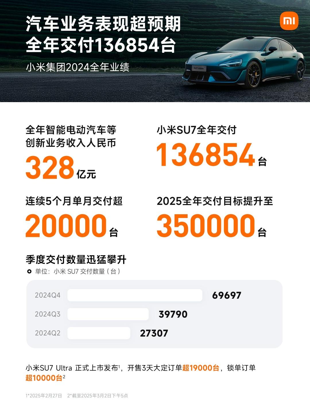 汽车业务方面,2024年,小米智能电动汽车等创新业务总收入人民币328亿元,首款车Xiaomi SU7系列年交付量达136854台,超额完成全年销售目标。Xiaomi SU7 Ultra于今年2月底正式发布,重新定义豪车新标准,开售10分钟大定突破6900台,开售2小时大定突破1万台,开售3天,大定突破 1.9万台,锁单超过1万台,提前完成全年销售任务。首批车主中,以30-35岁为主,女性车主占比接近20%且正在不断上升。