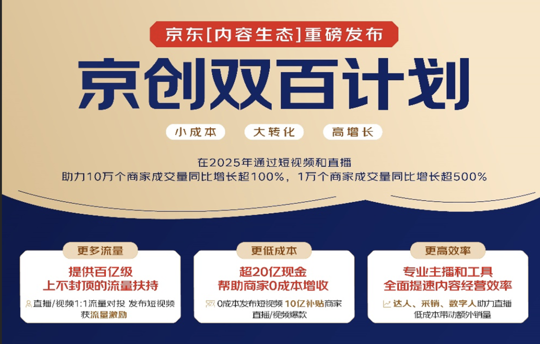 3月18日,京东首届“商家内容大会”举行,为品牌及商家在内容生态(短视频和直播)锚定增长新方向。当日,京东正式推出“京创双百计划”,以构建全域内容生态为核心,将在2025年投入超百亿流量、20亿现金,通过短视频和直播助力10万个商家成交量同比增长超100%,1万个商家成交量同比增长超500%。