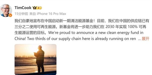 3月24日,苹果CEO库克在微博发文称,我们自豪地宣布在中国启动新一期清洁能源基金!目前,我们在中国的供应链已有三分之二使用可再生能源。新基金将进一步助力我们在2030年实现100%可再生能源运营的目标。
