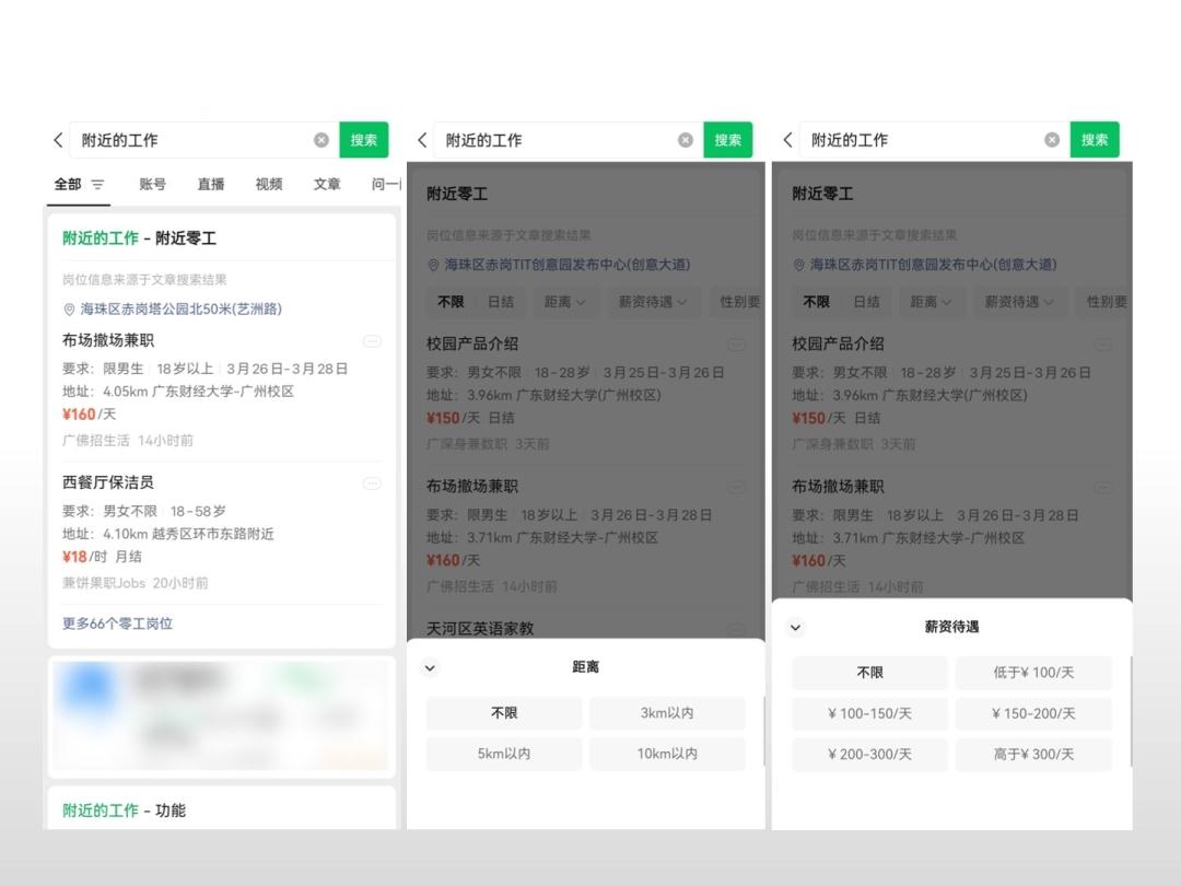 另一方面,用户也可在微信内搜索“附近的工作”“兼职”“日结”“零工”等关键词,搜索结果中也会通过岗位专区展示用户所在城市的零工岗位。
