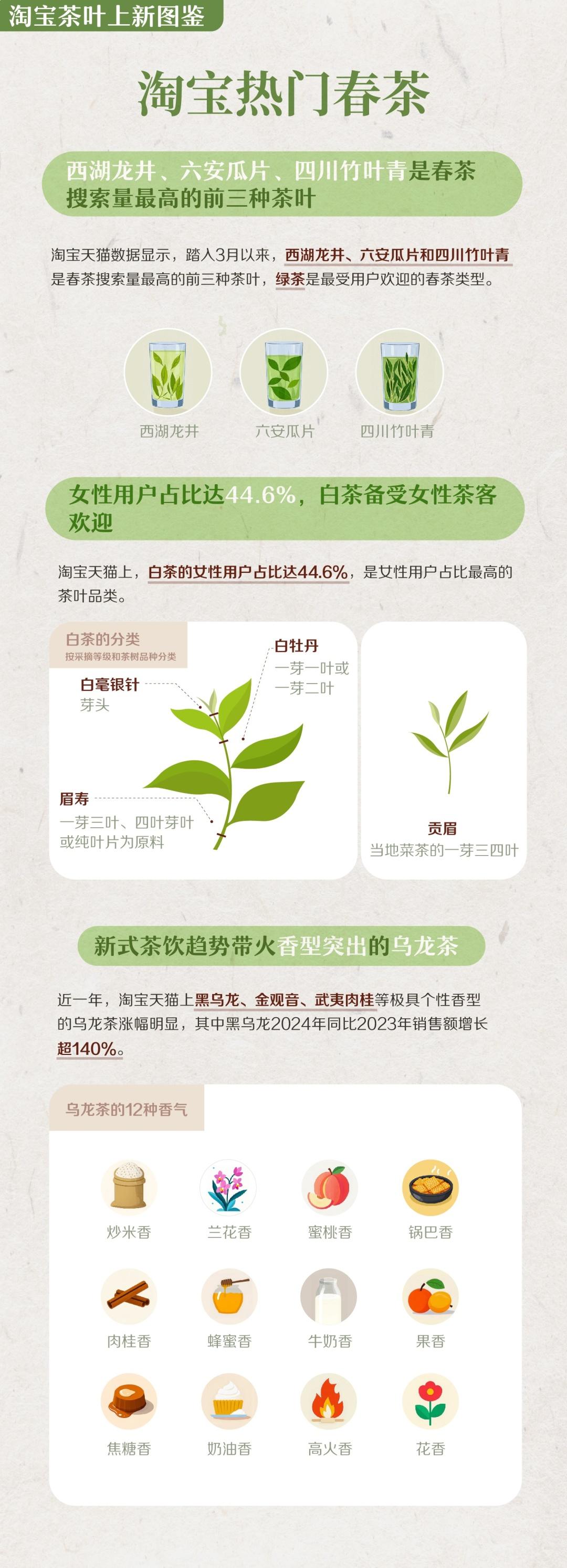 面对众多的春茶,该怎么选呢?对此,淘宝茶叶行业负责人表示,今年春茶季,淘宝联合多位制茶大师通过直播等方式,帮年轻茶客解锁选茶、品茶、存茶的攻略。“春茶虽然是非标品,但天猫上有严格的标准,针对‘西湖龙井’、‘安溪铁观音’、‘福鼎白茶’等有原产地心智的茶叶都需要持正规许可证和标识卡才能进行售卖。”