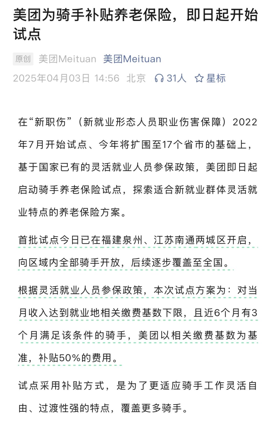 4月3日,美团发布公告称,将在福建泉州、江苏南通城区试点为骑手补贴养老保险。记者了解到,两个试点区域总计覆盖超过2.2万名外卖骑手。根据试点方案,对当月收入达到就业地相关缴费基数下限,且近6个月有3个月满足该条件的骑手,平台以相关缴费基数为基准,补贴50%的费用。据试点区域一名站长估算,站内约80%骑手可立即获得补贴资格。