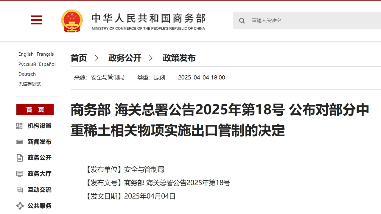商务部、海关总署发布公告,对中重稀土相关物项实施出口管制。根据《中华人民共和国出口管制法》等有关法律法规,4月4日,商务部会同海关总署发布关于对钐、钆、铽、镝、镥、钪、钇等7类中重稀土相关物项实施出口管制措施的公告,并于发布之日起正式实施。商务部新闻发言人就此答记者问时表示,此次中国政府依法对相关物项实施出口管制,目的是更好维护国家安全和利益,履行防扩散等国际义务。相关物项具有军民两用属性,对其实施出口管制是国际通行做法。中国作为一个负责任大国,将相关物项列管,体现了坚定维护世界和平与地区稳定的一贯立场。中方愿通过双边出口管制对话交流机制,加强对外交流与合作,促进合规贸易。