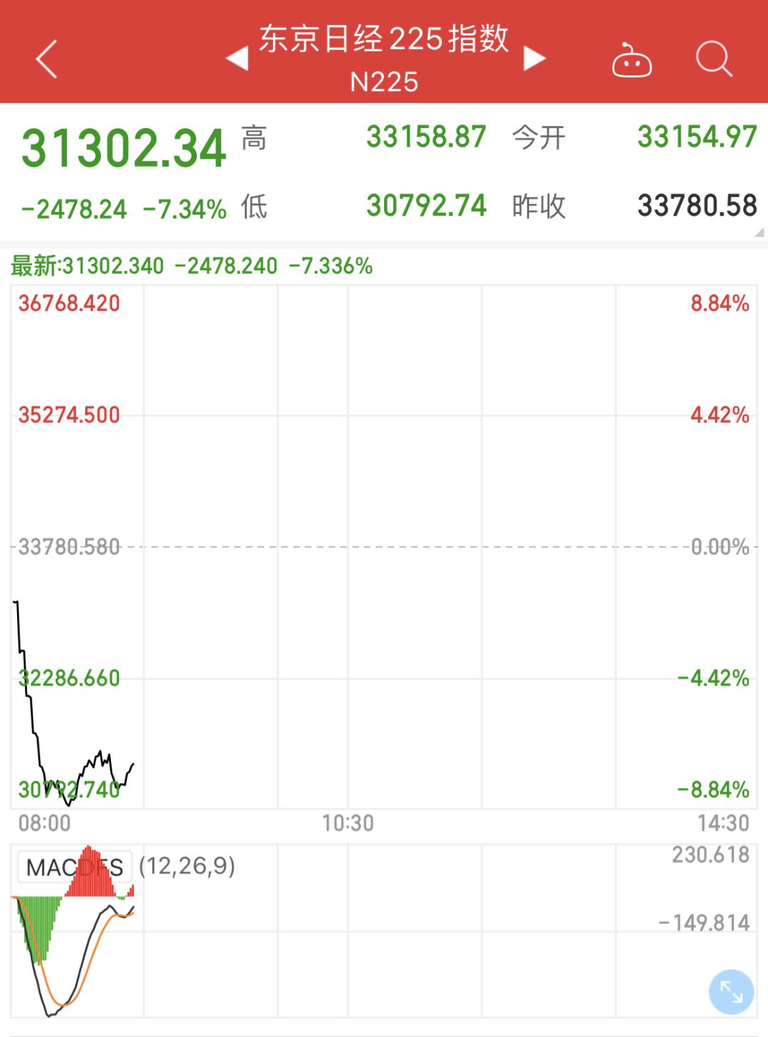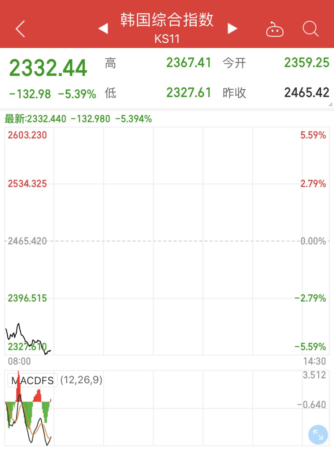亚太股市开盘大跌,截至发稿,日经225指数跌幅扩大至超8%,跌至2023年10月以来的最低水平;韩国KOSPI指数跌超5%,韩国紧急暂停KOSPI市场的程序化交易卖单。韩国财政部长称,将为迫切需要支持的行业准备相关措施。