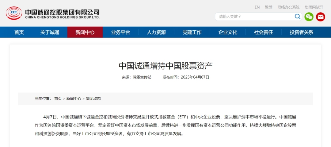 继中央汇金之后,又一大资金果断出手。4月7日晚间,中国诚通集团发布公告称,中国诚通旗下诚通金控和诚旸投资增持交易型开放式指数基金(ETF)和中央企业股票,坚决维护资本市场平稳运行。