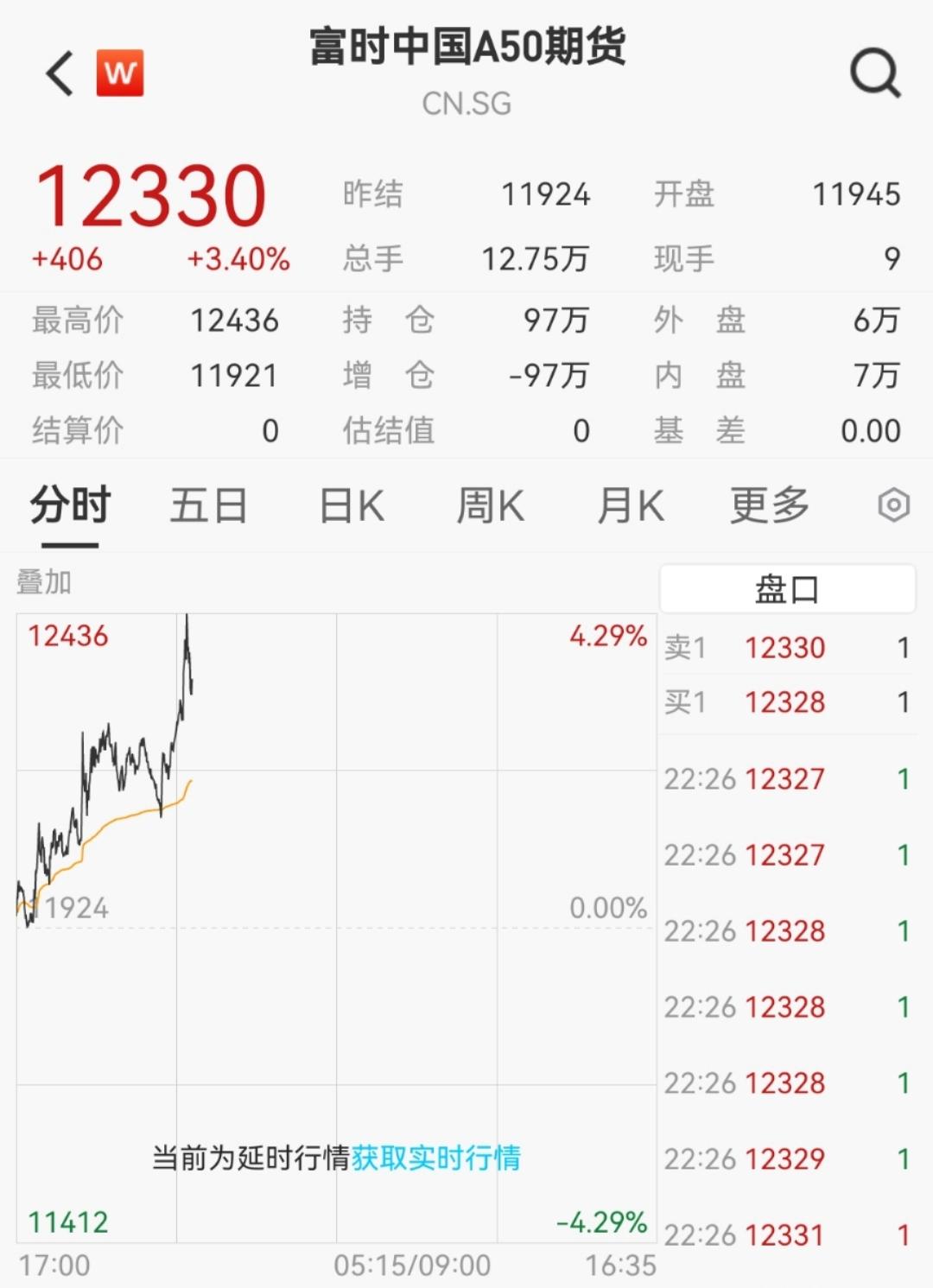 另一方面,富时中国A50指数期货夜盘开盘后一路震荡走高,22时许直线拉升涨至3%,最高涨幅达4.29%。