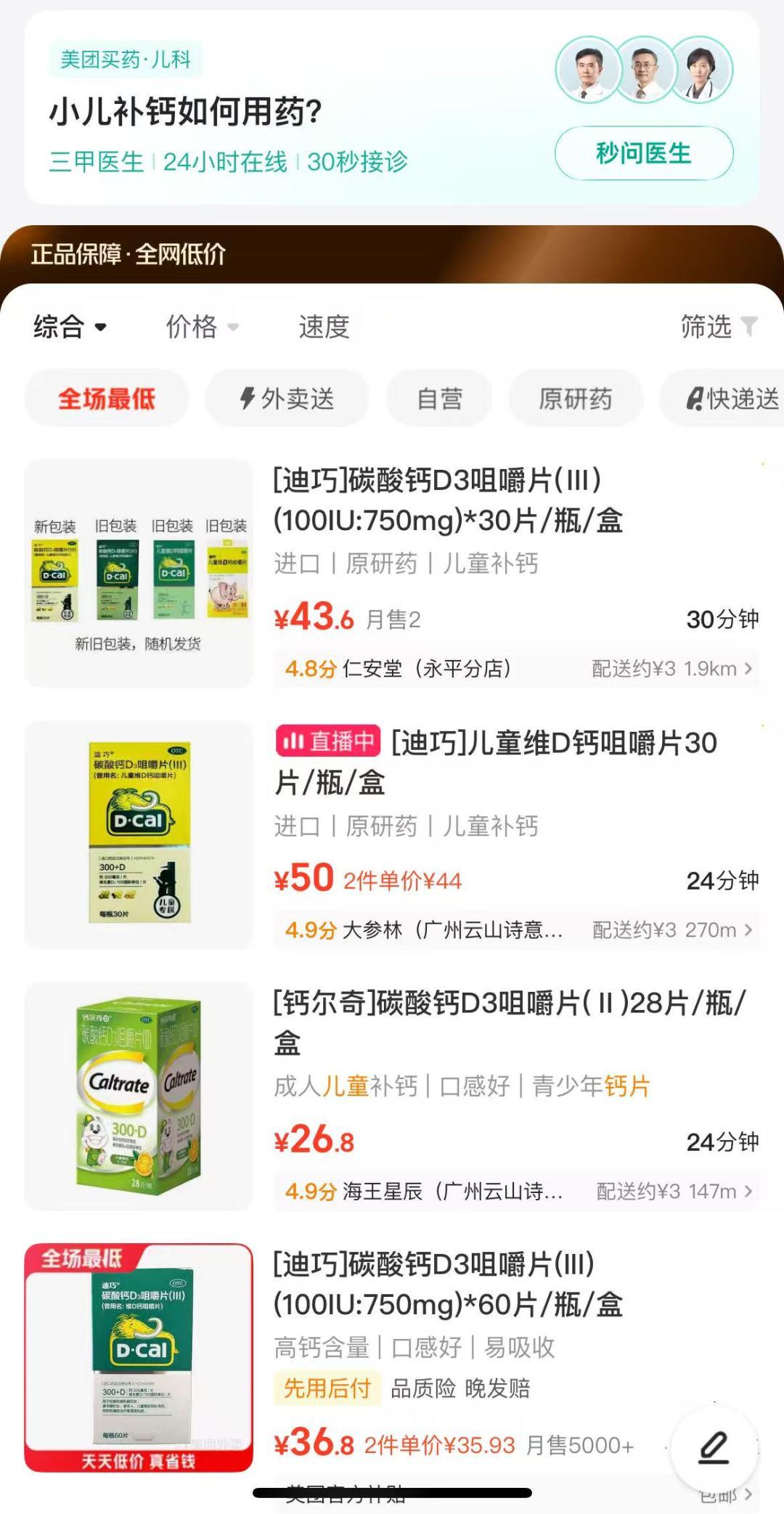 当前正值春季儿童补钙需求高峰期,不同品牌、剂型的儿童钙片都上线了即时零售渠道。记者留意到,美团买药的儿科“秒问医生”栏目也设置了热门问答如“小儿补钙如何用药?”等。