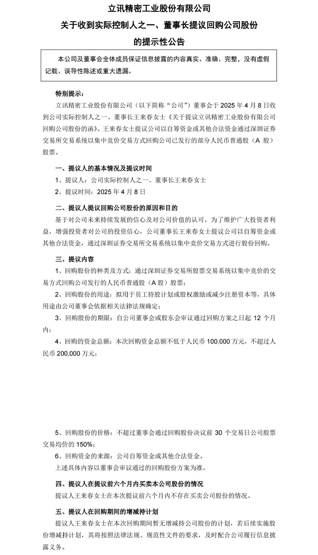 4月8日,立讯精密发布公告称,公司于2025年4月8日收到实际控制人之一、董事长王来春的提议,建议公司以自筹资金或其他合法资金,通过深圳证券交易所交易系统以集中竞价交易方式回购公司已发行的部分人民币普通股(A股)股票。回购资金总额不低于人民币100,000万元,不超过人民币200,000万元,回购期限为自董事会或股东会审议通过回购方案之日起12个月内。回购股份的用途拟用于员工持股计划或股权激励或减少注册资本等。回购股份的价格:不超过董事会通过回购股份决议前 30 个交易日公司股票交易均价的 150%。