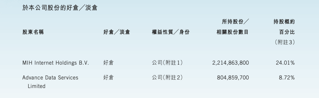 据年报披露,截至2024年12月31日,腾讯大股东Prosus通过MIHInternet Holdings持有2214863800股,持股比例为24.01%;Advance Data Services持有804859700股,持股比例为8.72%。公开资料显示,Advance Data Services为腾讯CEO马化腾全资持有公司。