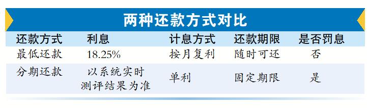 最低还款这一方式比较灵活,随时可还,按日计息,日息万分之五(单利计算折合年化利息18.25%),但是该方式是按月收取复利,即到下一期没有全部还清的话,上一期产生的利息也要计息。