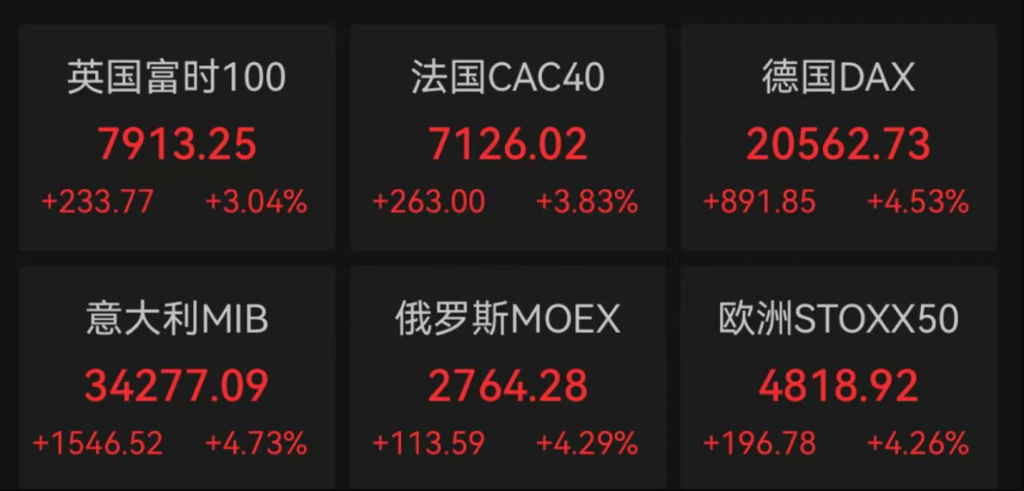 欧洲三大股指则全线上涨。英国富时100指数报收于7913.25点,涨3.04%;法国CAC40指数报收于7126.02点,涨3.83%;德国DAX30指数报收于20562.73点,涨4.53%;意大利富时MIB指数报收于34277.09点,涨4.73%。