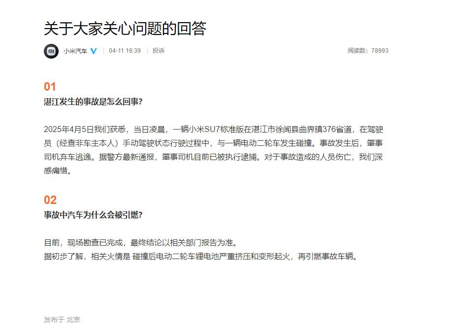 4月11日,小米汽车就湛江事故发布情况说明。小米汽车表示,2025年4月5日获悉,当日凌晨,一辆小米SU7标准版在湛江市徐闻县曲界镇376省道,在驾驶员(经查非车主本人)手动驾驶状态行驶过程中,与一辆电动二轮车发生碰撞。事故发生后,肇事司机弃车逃逸。据警方最新通报,肇事司机目前已被执行逮捕。关于事故中汽车为什么会被引燃,小米汽车表示,目前,现场勘查已完成,最终结论以相关部门报告为准。据初步了解,相关火情是碰撞后电动二轮车锂电池严重挤压和变形起火,再引燃事故车辆。
